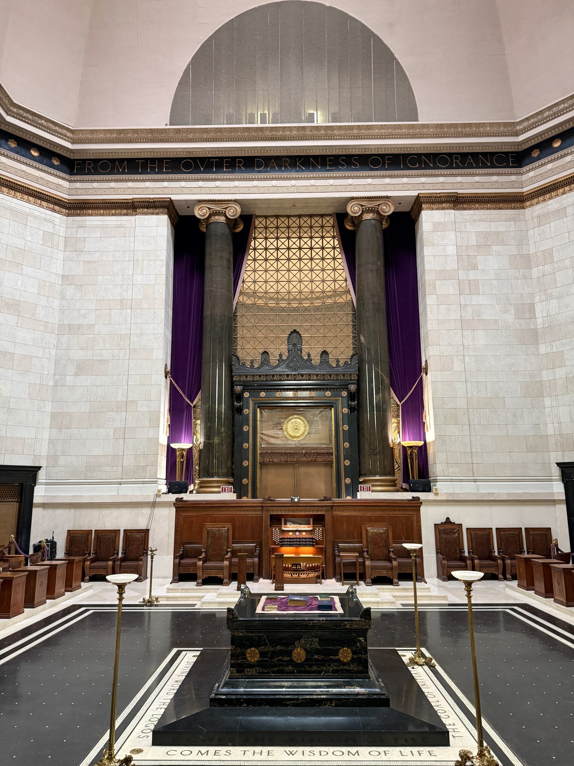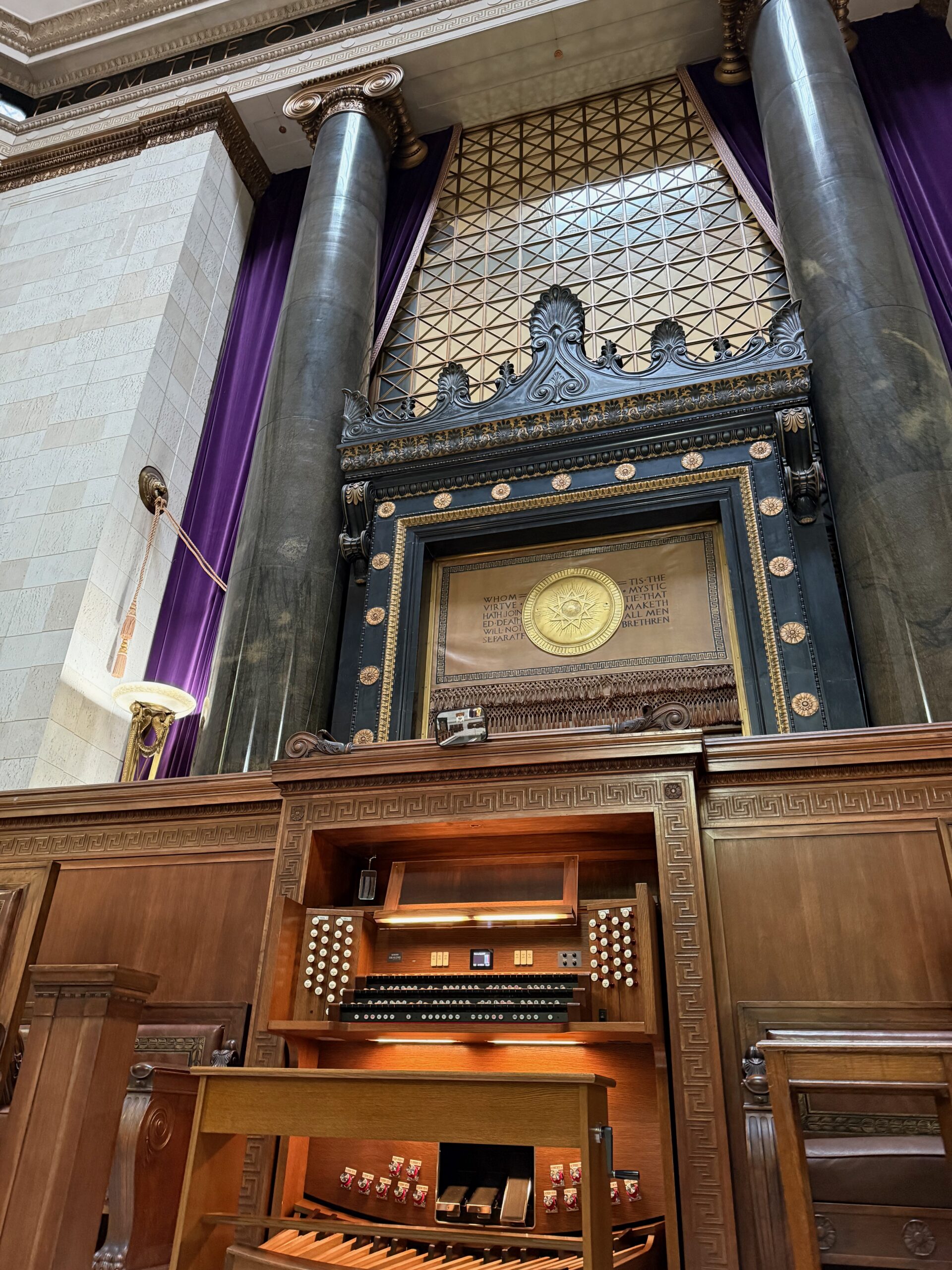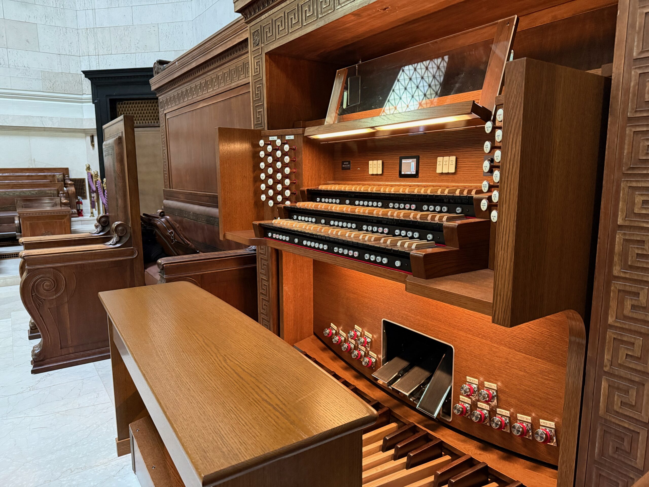 The Supreme Council of the 33rd Degree of the Scottish Rite worked closely with R. A. Daffer Church Organs, Inc. to restore and expand their historic 27 rank, two manual Schantz Pipe Organ. The resulting instrument is a Custom Rodger Hybrid Organ composed of three manuals, fifty-one stops, reverse wooden keys and beautifully carved Pau Ferro wood draw knobs. The console was custom made in order to fit into an intricately carved walnut niche. The new digital components and speakers are located 100 feet above in the organ chamber along side the newly-restored pipework and solid state components. The stunning new organ is a success because of the hand-in-glove relationship between the Scottish Rite and Bill Teyssier, Senior Pipe Technician, Daffer Church Organs.
