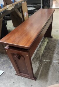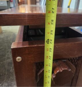 Reddish finish with fancy sides.  Adjusts with a giant knob on the side.  Adjusts from 24 1/2 inches to almost 27 inches as shown.
